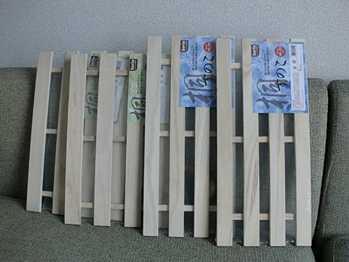 すのこを2つ用意します。あとは、本の転倒防止用のポールやストッパー用金具、もしくは紐を入手しておきましょう。